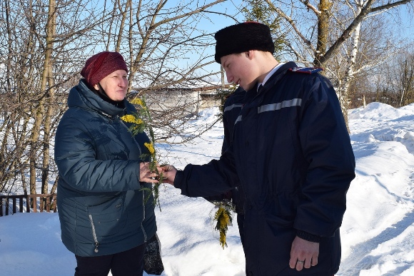 С самым красивым и светлым весенним праздником жительниц Лесного поздравили волонтёры кадетского казачьего класса Лесновского ДДТ