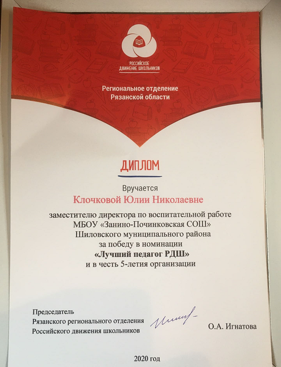 Дипломом Рязанского регионального отделения РДШ в номинации «Лучший педагог РДШ» награждена заместитель директора по воспитательной работе Занино-Починковской школы Юлия Николаевна Клочкова.