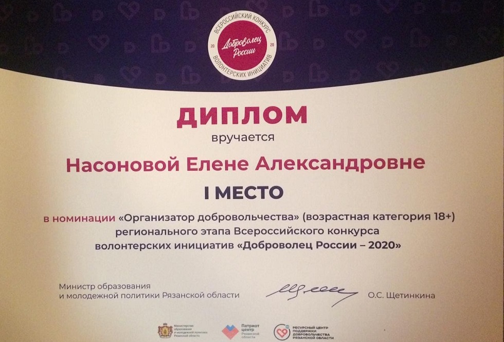 Среди награждённых - руководитель центра поддержки добровольчества в Шиловском районе Насонова Елена Александровна, которая заняла I место в номинации «Организатор добровольчества».